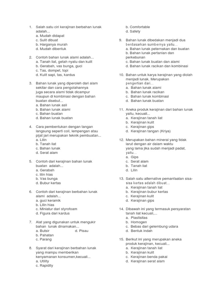 Soal Prakarya from imgv2-2-f.scribdassets.com We did not find results for: Check spelling or type a new query. Maybe you would like to learn more about one of these? Salah satu ciri kerajinan berbahan lunak adalah a sulit dibuat b mudah dibentuk c bentuknya bagus.
